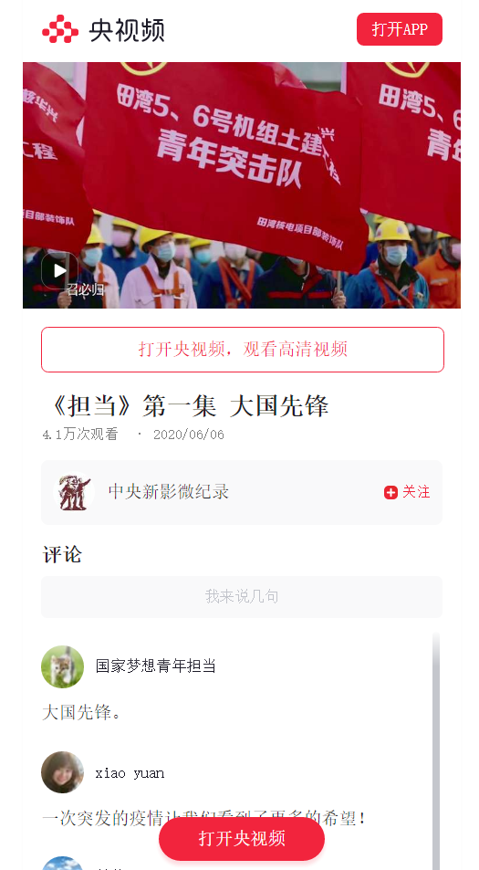 由国务院国资委宣传工作局,近百家中央企业,中央新影集团,爱奇艺社会责任联合推出的新媒体纪录片《担当-中央企业抗击新冠肺炎疫情纪实》在央视频、爱奇艺平台发布。该片既有执着坚守、感人事迹,又有央企责任、家国情怀,彰显了在关键时刻中央企业大国顶梁柱,党和国家最可信赖依靠力量的使命、担当和作为。